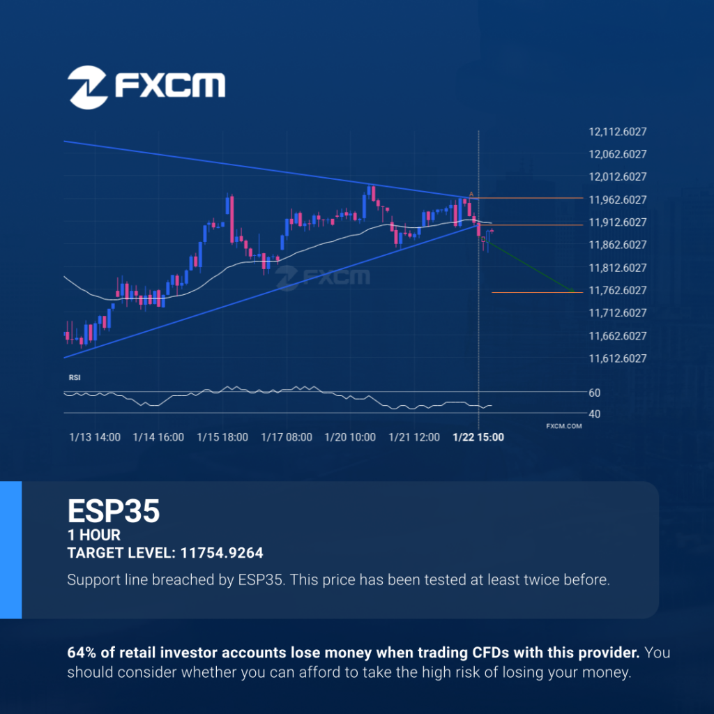 The last 13 1 hour candles on ESP35 formed a Triangle pattern and broken out through the pattern lines, indicating a possible bearish movement towards the price level of 11754.9264. Past performance is not an indicator of future results. Trading leveraged products carries significant risk. Please refer to PDS and TMD on our website. AFSL#309763