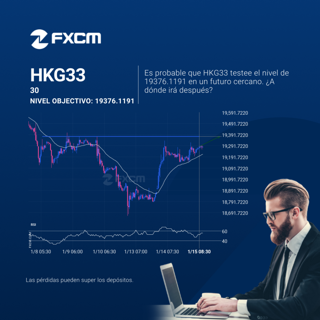 HKG33 se está acercando a una línea de resistencia en 19376.1191. Si llega a la línea de resistencia, puede atravesar este nivel para continuar con la tendencia alcista, o puede girarse y volver a los niveles actuales. El rendimiento pasado no es indicativo de resultados futuros. Las pérdidas pueden exceder los fondos depositados.