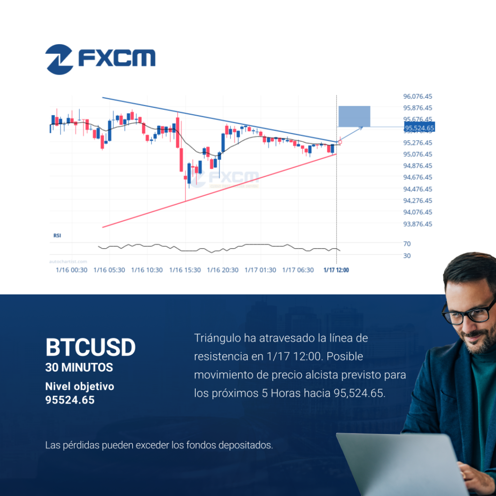 Triángulo ha atravesado la línea de resistencia en 1/17 12:00. Posible movimiento de precio alcista previsto para los próximos 5 Horas hacia 95,524.65. El rendimiento pasado no es indicativo de resultados futuros. Las pérdidas pueden exceder los depósitos.
