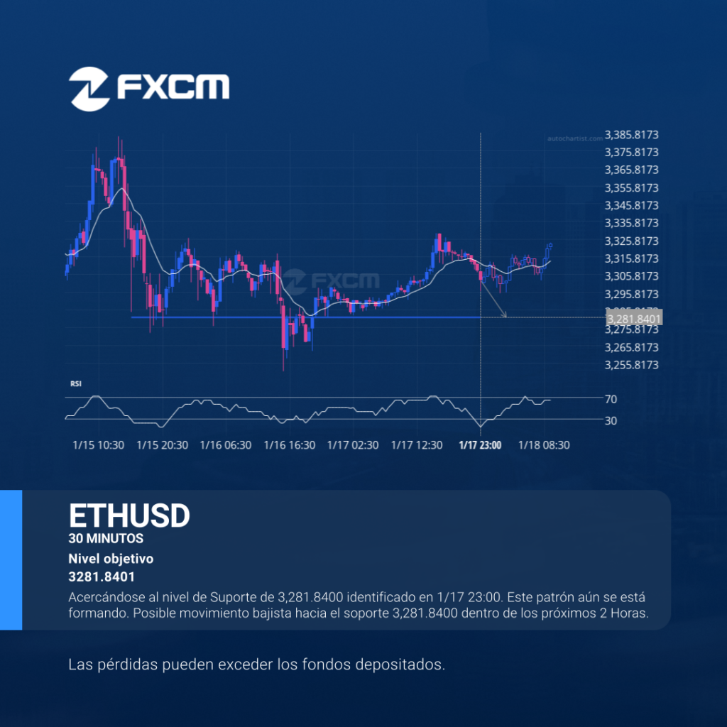 Acercándose al nivel de Suporte de 3,281.8400 identificado en 1/17 23:00. Este patrón aún se está formando. Posible movimiento bajista hacia el soporte 3,281.8400 dentro de los próximos 2 Horas. El rendimiento pasado no es indicativo de resultados futuros. Las pérdidas pueden exceder los depósitos.
