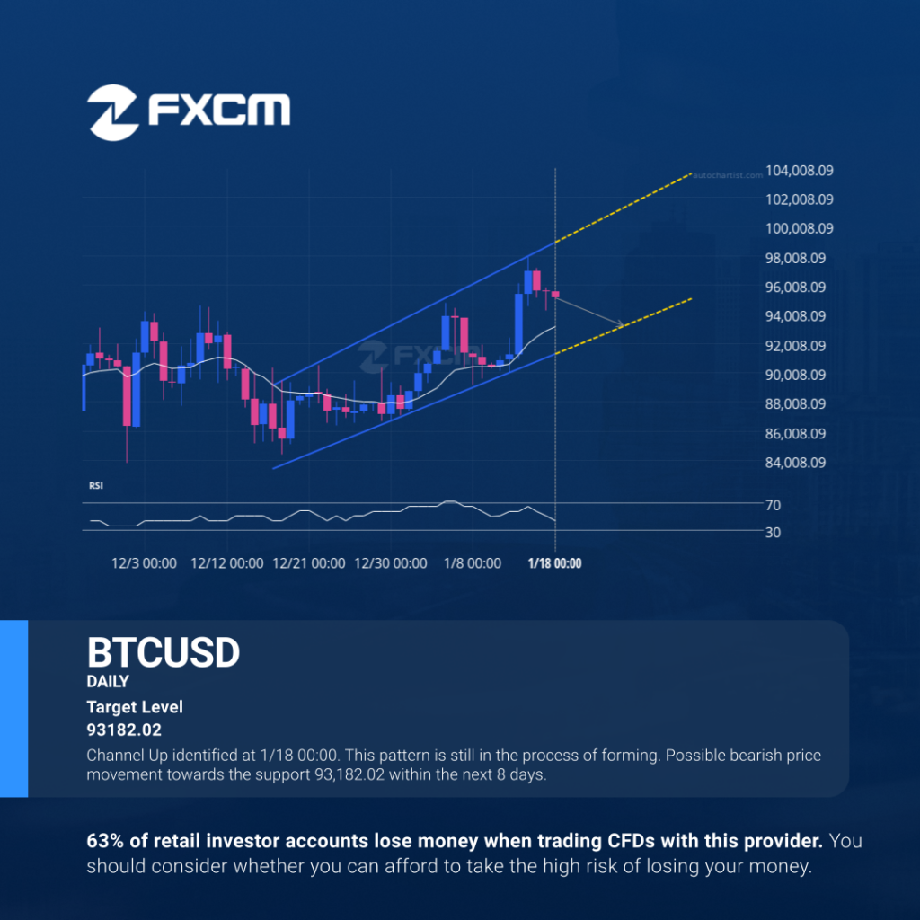 Channel Up identified at 1/18 00:00. This pattern is still in the process of forming. Possible bearish price movement towards the support 93,182.02 within the next 8 days. Past performance is not an indicator of future results. Losses can exceed deposits.