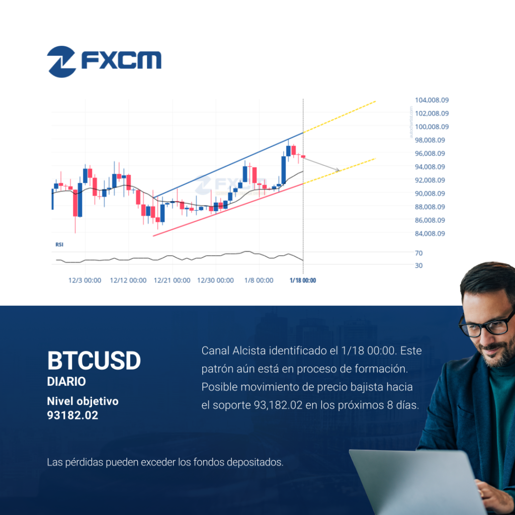 Canal Alcista identificado el 1/18 00:00. Este patrón aún está en proceso de formación. Posible movimiento de precio bajista hacia el soporte 93,182.02 en los próximos 8 días. Las pérdidas pueden exceder los depósitos.