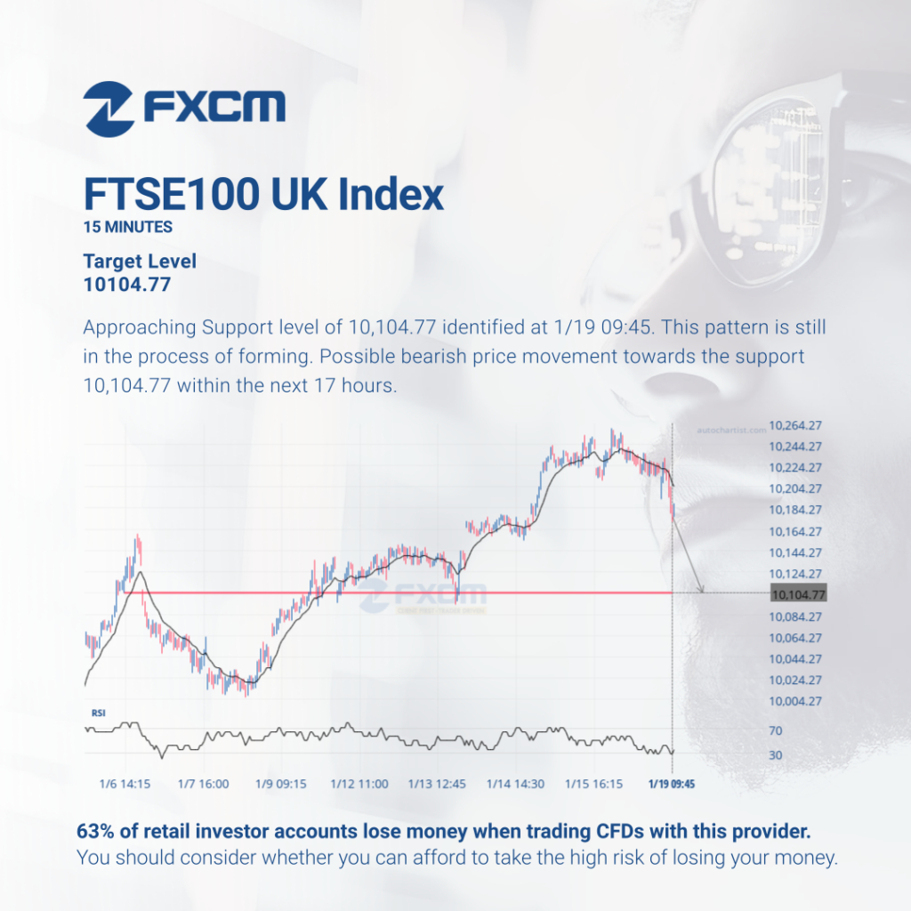 Approaching Support level of 10,104.77 identified at 1/19 09:45. This pattern is still in the process of forming. Possible bearish price movement towards the support 10,104.77 within the next 17 hours. Past performance is not an indicator of future results. Losses can exceed deposits.