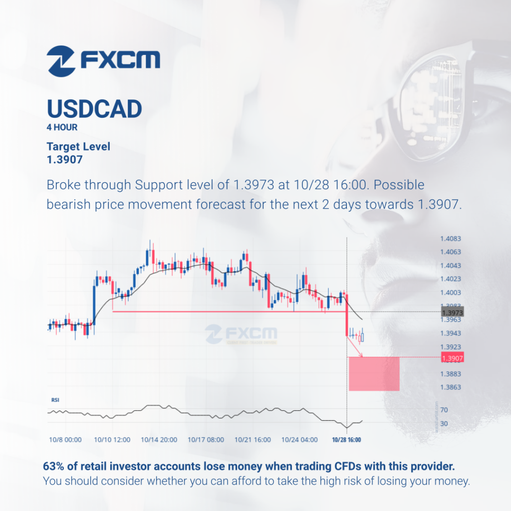 Broke through Support level of 1.3973 at 10/28 16:00. Possible bearish price movement forecast for the next 2 days towards 1.3907. Past performance is not an indicator of future results. Losses can exceed deposits.