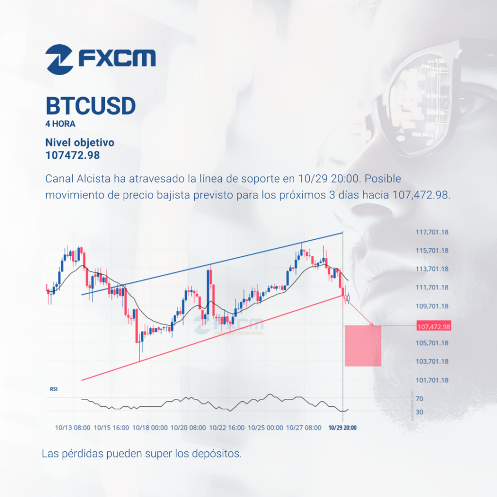 Canal Alcista ha atravesado la línea de soporte en 10/29 20:00. Posible movimiento de precio bajista previsto para los próximos 3 días hacia 107,472.98. El rendimiento pasado no es indicativo de resultados futuros. Las pérdidas pueden exceder los fondos depositados.