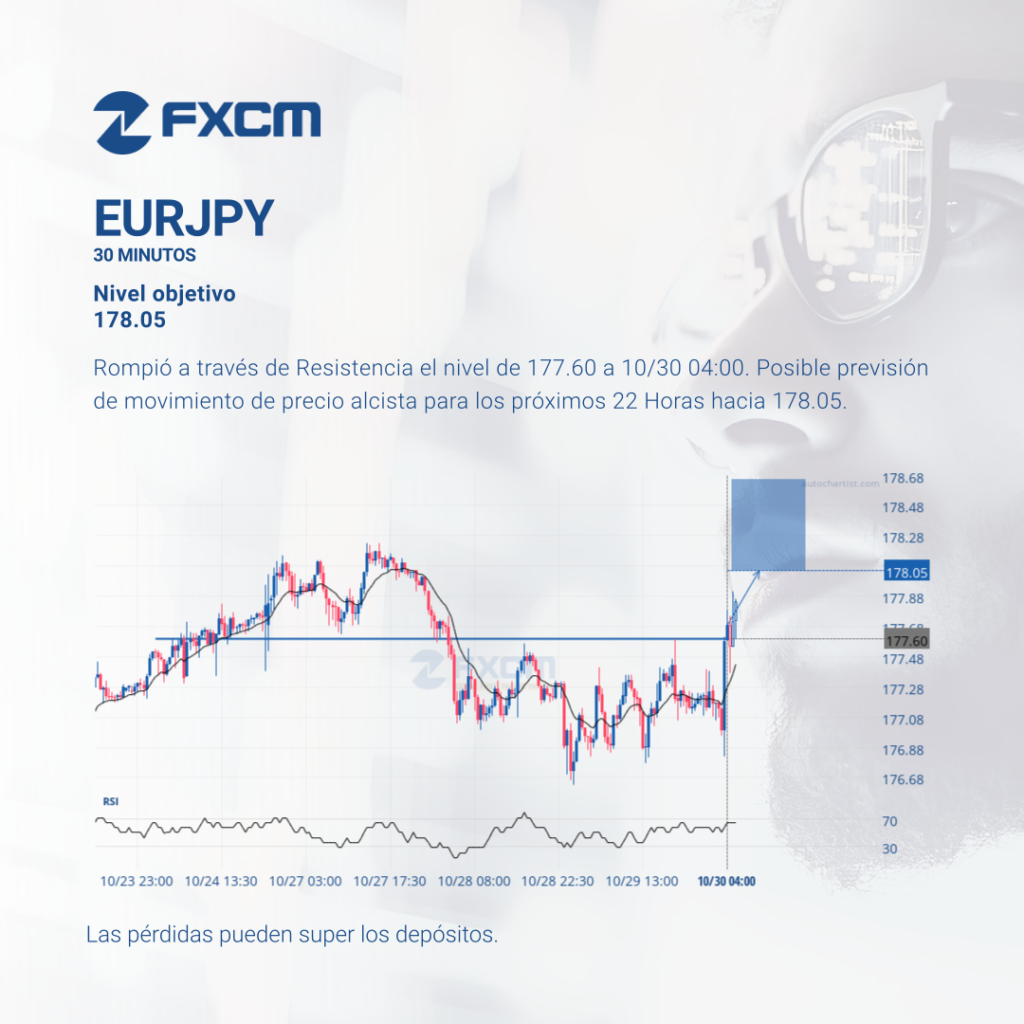 Rompió a través de Resistencia el nivel de 177.60 a 10/30 04:00. Posible previsión de movimiento de precio alcista para los próximos 22 Horas hacia 178.05. El rendimiento pasado no es indicativo de resultados futuros. Las pérdidas pueden exceder los fondos depositados.