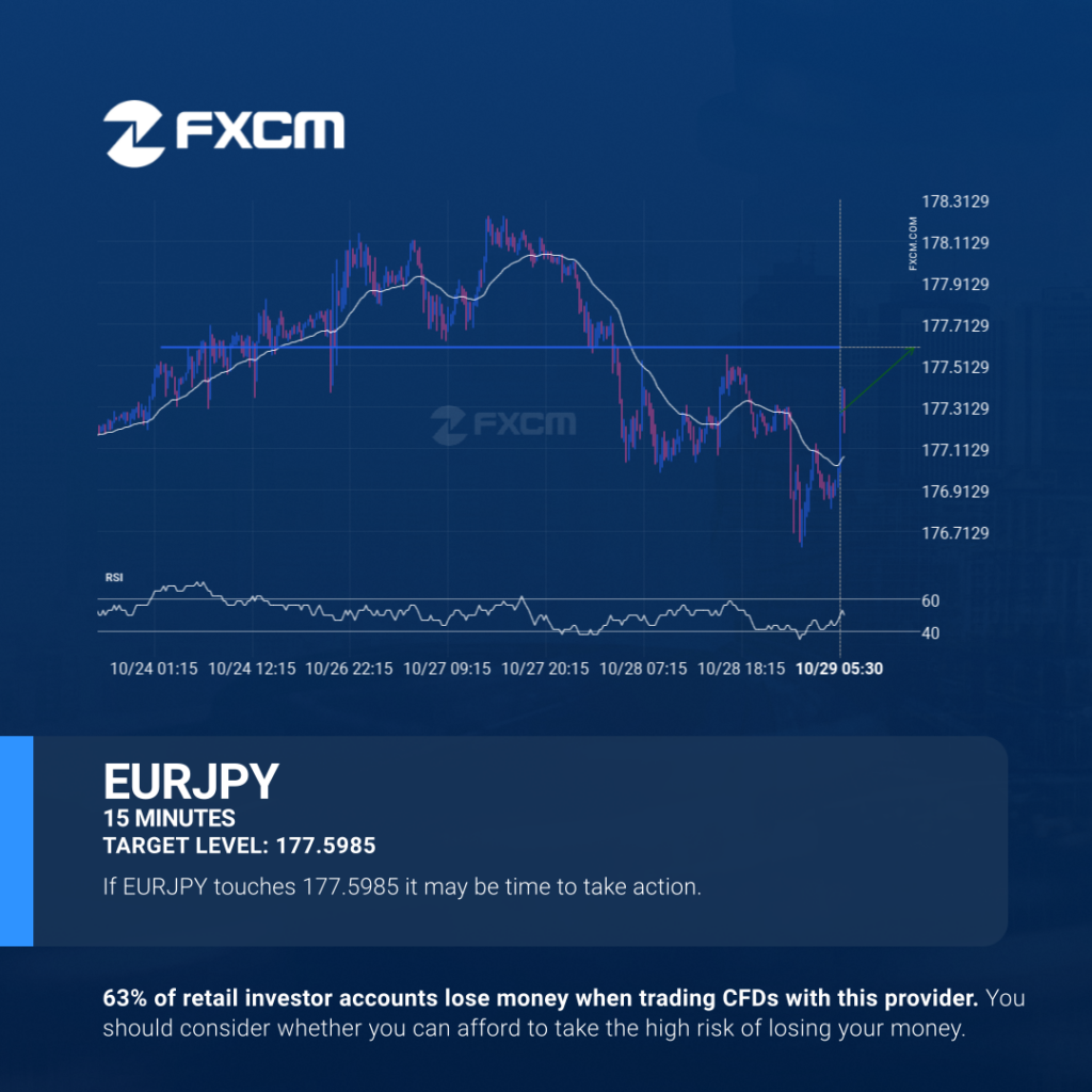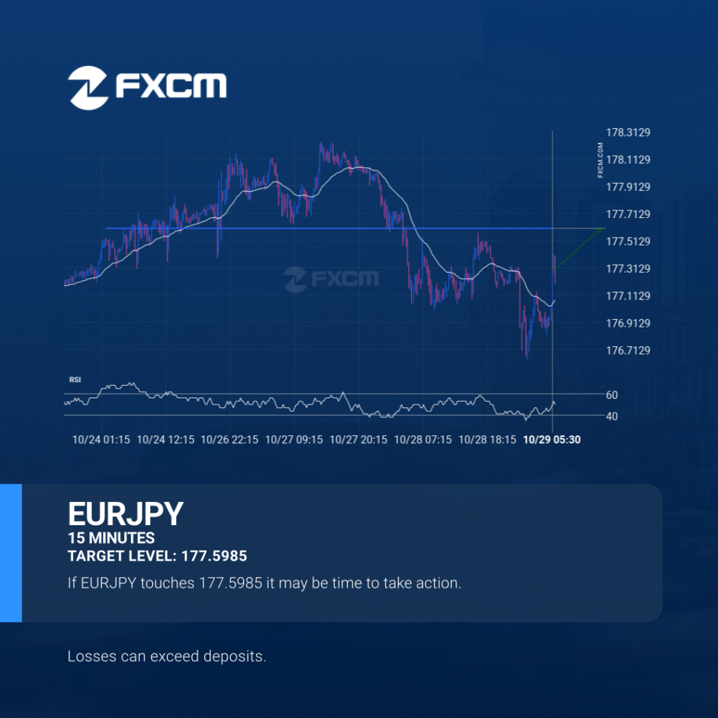 EURJPY is approaching a resistance line at 177.5985. If it hits the resistance line, it may break through this level to continue the bullish trend, or it may turn around back to current levels. Past performance is not an indicator of future results. Losses can exceed deposits.