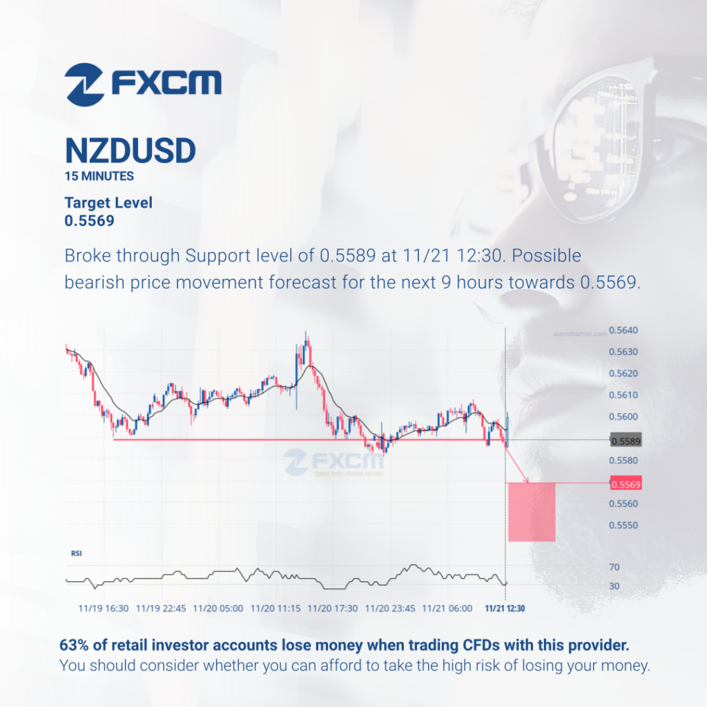 Broke through Support level of 0.5589 at 11/21 12:30. Possible bearish price movement forecast for the next 9 hours towards 0.5569. Past performance is not an indicator of future results. Losses can exceed deposits.