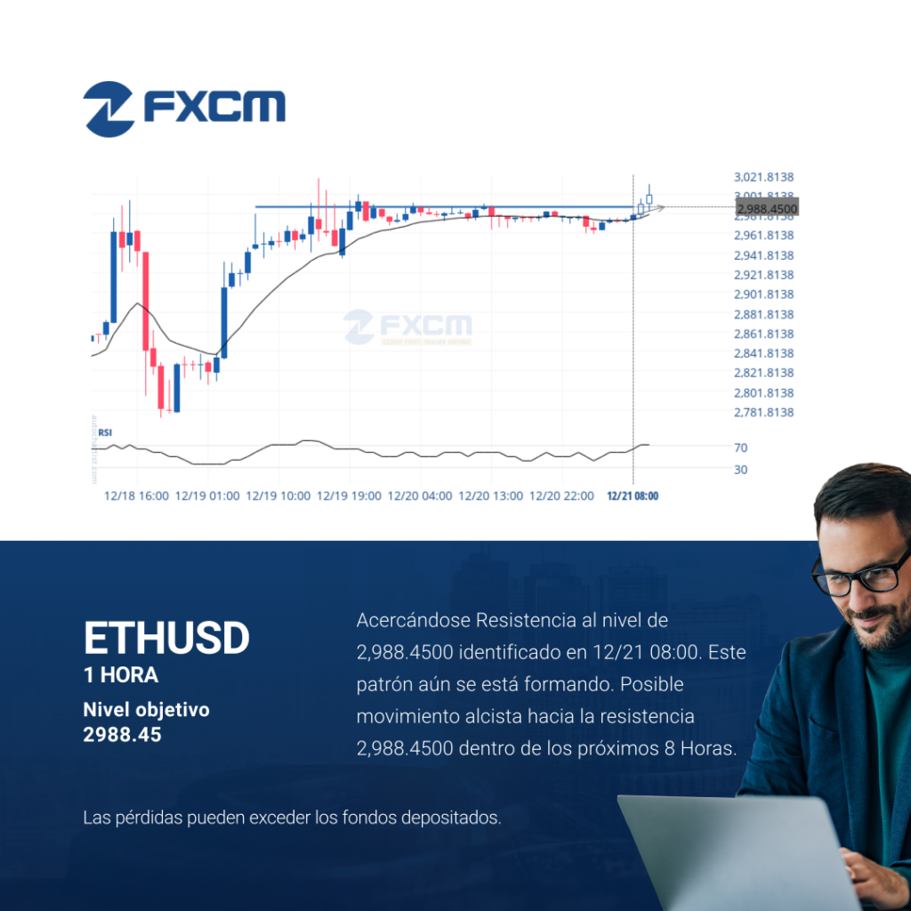 Acercándose Resistencia al nivel de 2,988.4500 identificado en 12/21 08:00. Este patrón aún se está formando. Posible movimiento alcista hacia la resistencia 2,988.4500 dentro de los próximos 8 Horas. Las pérdidas pueden exceder los depósitos.