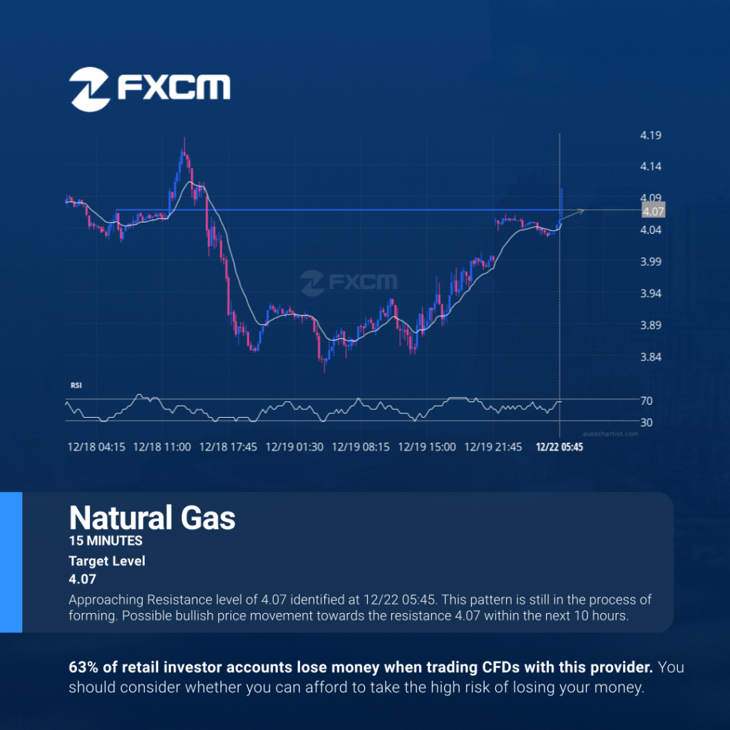 Approaching Resistance level of 4.07 identified at 12/22 05:45. This pattern is still in the process of forming. Possible bullish price movement towards the resistance 4.07 within the next 10 hours. Past performance is not an indicator of future results. Losses can exceed deposits.