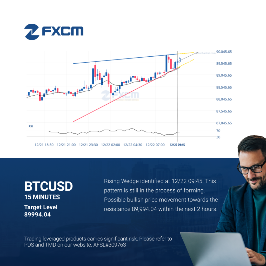 Rising Wedge identified at 12/22 09:45. This pattern is still in the process of forming. Possible bullish price movement towards the resistance 89,994.04 within the next 2 hours. Past performance is not an indicator of future results. Trading leveraged products carries significant risk. Please refer to PDS and TMD on our website. AFSL#309763