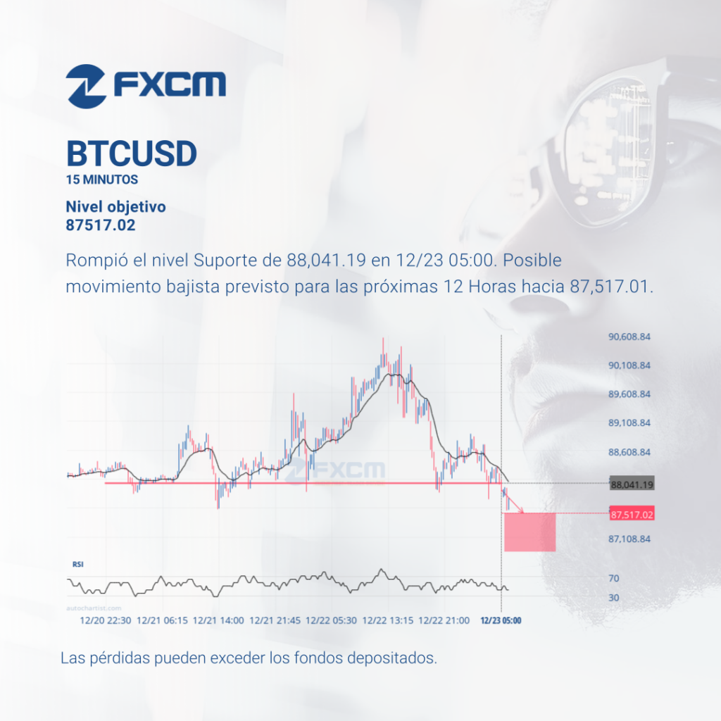 Rompió el nivel Suporte de 88,041.19 en 12/23 05:00. Posible movimiento bajista previsto para las próximas 12 Horas hacia 87,517.01. El rendimiento pasado no es indicativo de resultados futuros. Las pérdidas pueden exceder los depósitos.