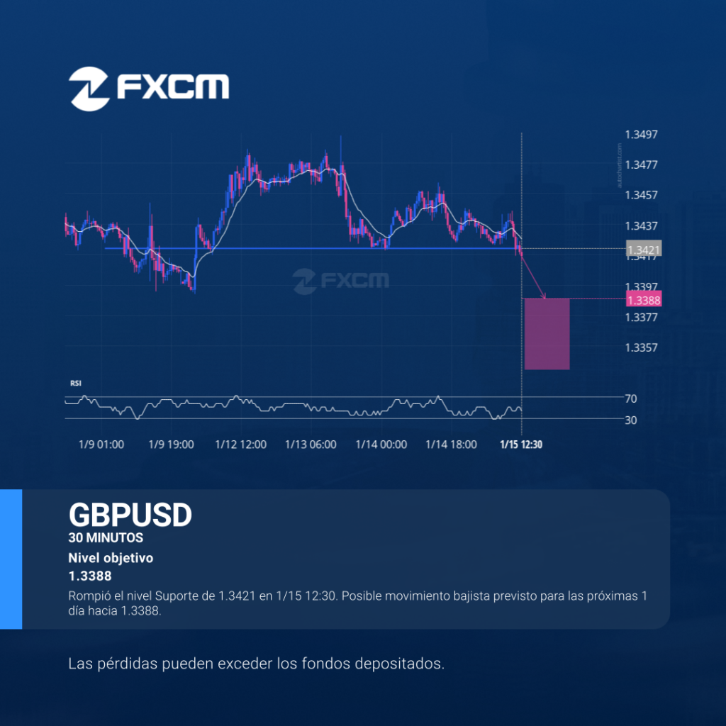 Rompió el nivel Suporte de 1.3421 en 1/15 12:30. Posible movimiento bajista previsto para las próximas 1 día hacia 1.3388. El rendimiento pasado no es indicativo de resultados futuros. Las pérdidas pueden exceder los depósitos.