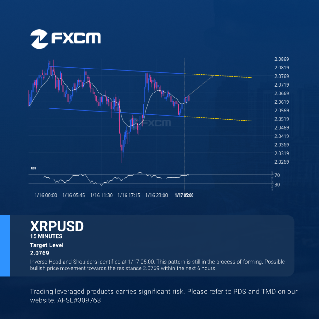Inverse Head and Shoulders identified at 1/17 05:00. This pattern is still in the process of forming. Possible bullish price movement towards the resistance 2.0769 within the next 6 hours. Past performance is not an indicator of future results. Trading leveraged products carries significant risk. Please refer to PDS and TMD on our website. AFSL#309763