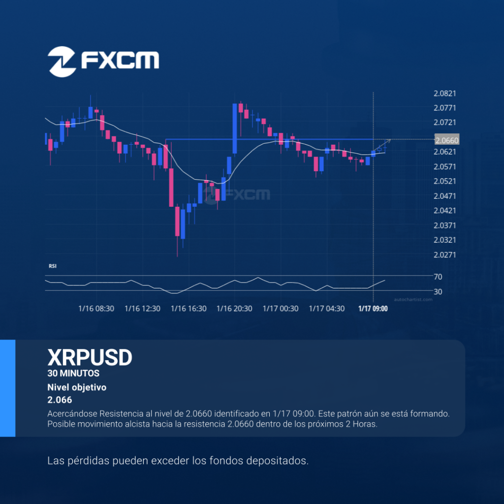 Acercándose Resistencia al nivel de 2.0660 identificado en 1/17 09:00. Este patrón aún se está formando. Posible movimiento alcista hacia la resistencia 2.0660 dentro de los próximos 2 Horas. El rendimiento pasado no es indicativo de resultados futuros. Las pérdidas pueden exceder los depósitos.