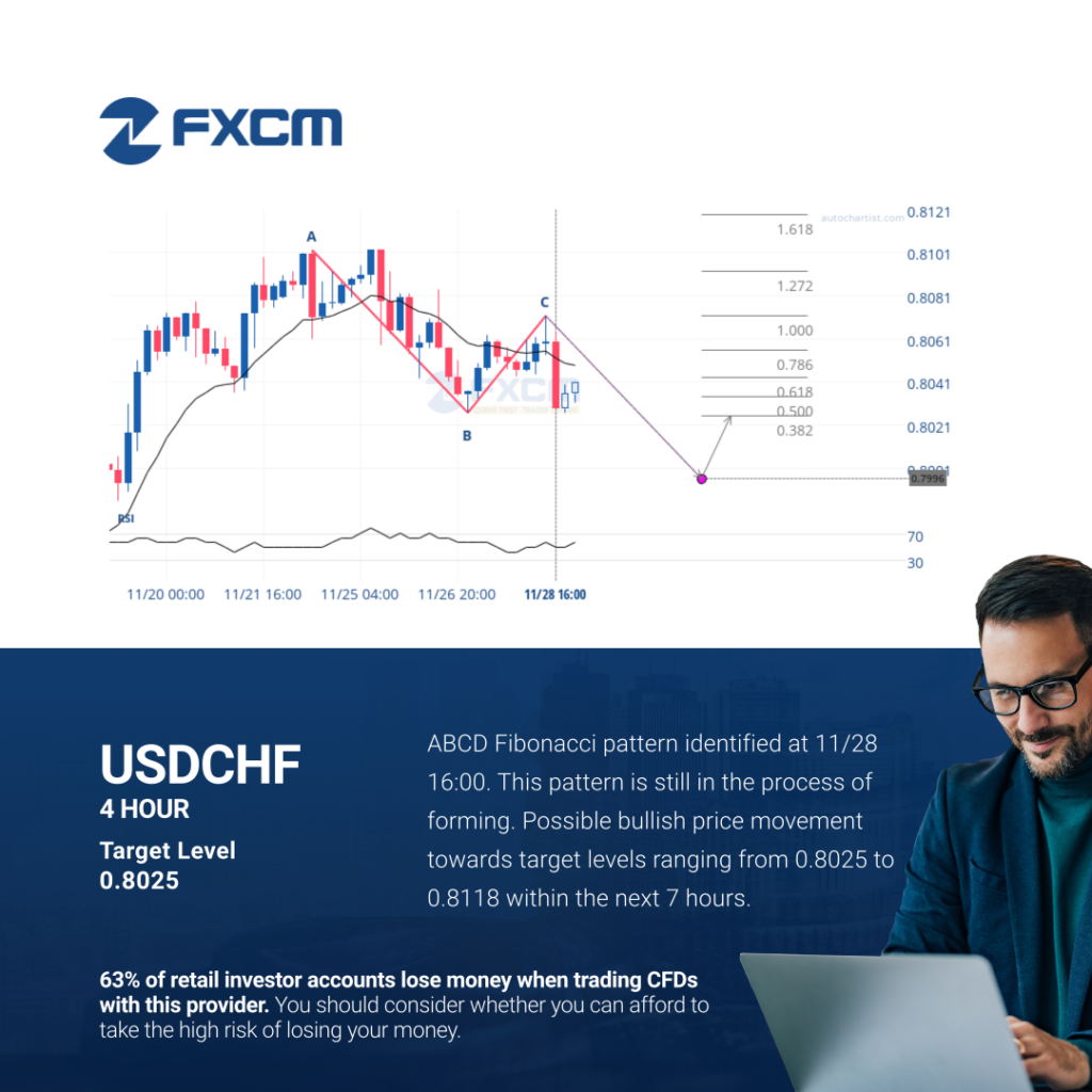 ABCD Fibonacci pattern identified at 11/28 16:00. This pattern is still in the process of forming. Possible bullish price movement towards target levels ranging from 0.8025 to 0.8118 within the next 7 hours. Past performance is not an indicator of future results. Losses can exceed deposits.