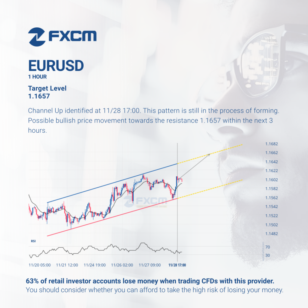 Channel Up identified at 11/28 17:00. This pattern is still in the process of forming. Possible bullish price movement towards the resistance 1.1657 within the next 3 hours. Past performance is not an indicator of future results. Losses can exceed deposits.