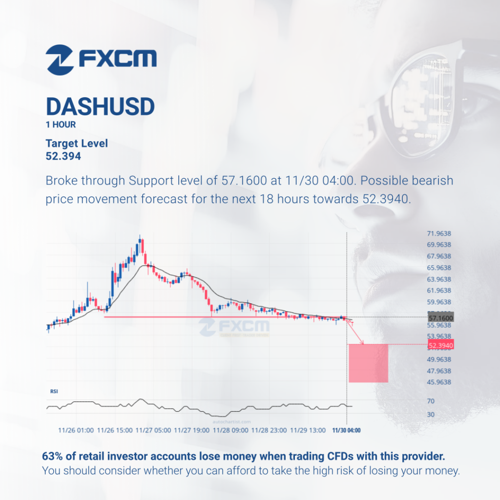 Broke through Support level of 57.1600 at 11/30 04:00. Possible bearish price movement forecast for the next 18 hours towards 52.3940. Past performance is not an indicator of future results. Losses can exceed deposits.