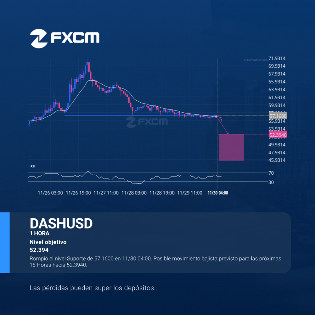 Rompió el nivel Suporte de 57.1600 en 11/30 04:00. Posible movimiento bajista previsto para las próximas 18 Horas hacia 52.3940. El rendimiento pasado no es indicativo de resultados futuros. Las pérdidas pueden exceder los fondos depositados.