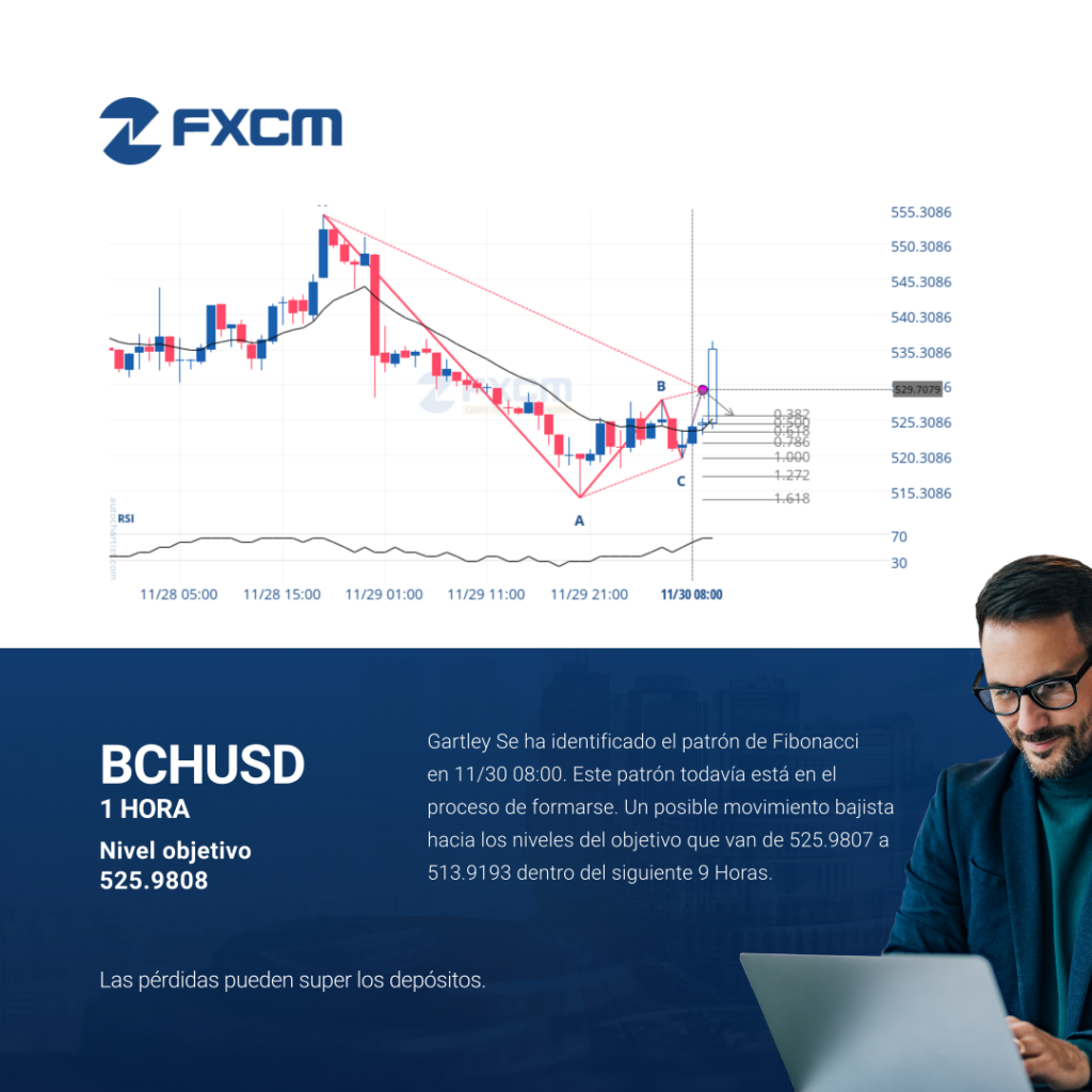 Gartley Se ha identificado el patrón de Fibonacci en 11/30 08:00. Este patrón todavía está en el proceso de formarse. Un posible movimiento bajista hacia los niveles del objetivo que van de 525.9807 a 513.9193 dentro del siguiente 9 Horas. El rendimiento pasado no es indicativo de resultados futuros. Las pérdidas pueden exceder los fondos depositados.