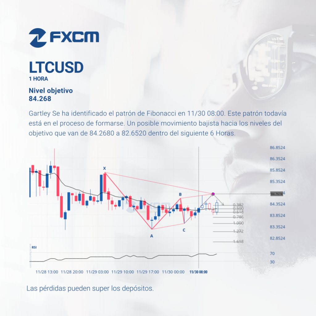 Gartley Se ha identificado el patrón de Fibonacci en 11/30 08:00. Este patrón todavía está en el proceso de formarse. Un posible movimiento bajista hacia los niveles del objetivo que van de 84.2680 a 82.6520 dentro del siguiente 6 Horas. El rendimiento pasado no es indicativo de resultados futuros. Las pérdidas pueden exceder los fondos depositados.
