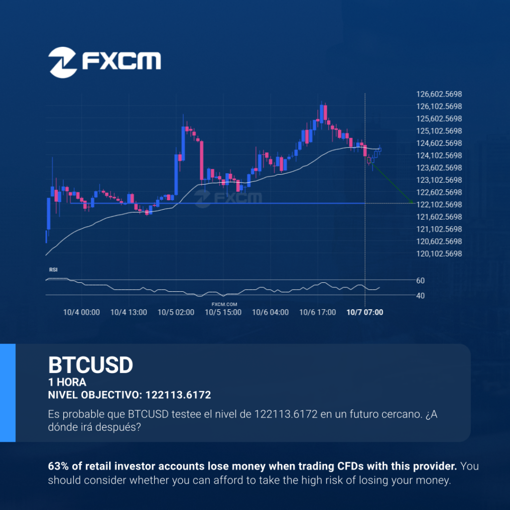 BTCUSD se está moviendo hacia un nivel clave de soporte en 122113.6172. BTCUSD testeó previamente este nivel 4 veces y en cada ocasión rebotó en este nivel. ¿Ha llegado finalmente el momento de la rotura? El rendimiento pasado no es indicativo de resultados futuros. Las pérdidas pueden exceder los fondos depositados.