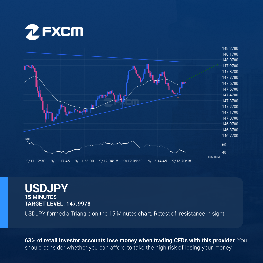 USDJPY is heading towards the resistance line of a Triangle. If this movement continues, the price of USDJPY could test 147.9978 within the next 9 hours. It has tested this line numerous times in the past, so this movement could be short-lived and end up rebounding just like it did in the past.