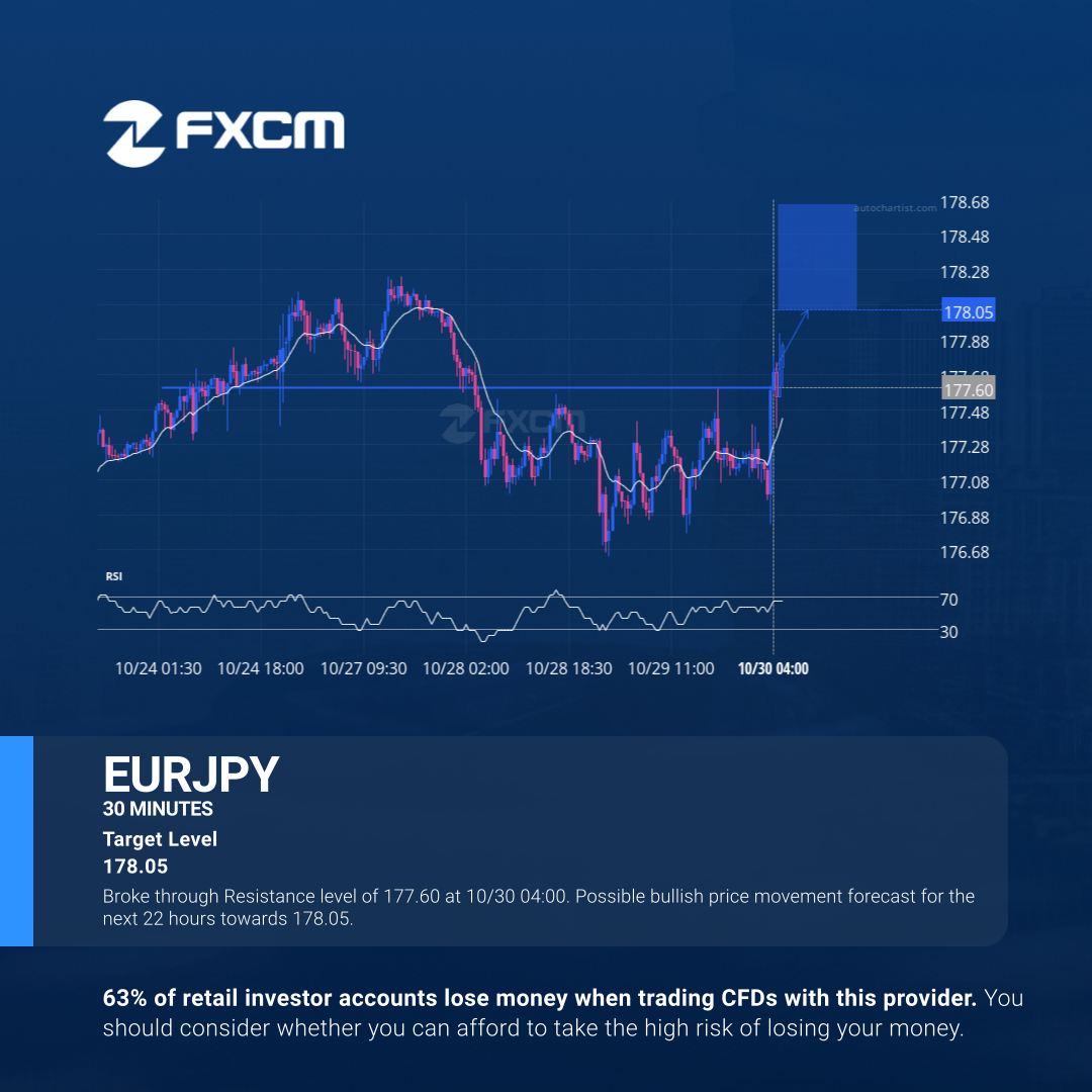 Broke through Resistance level of 177.60 at 10/30 04:00. Possible bullish price movement forecast for the next 22 hours towards 178.05.