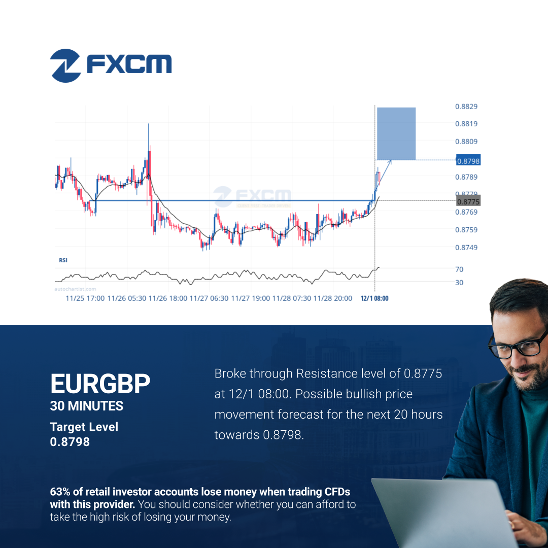 Broke through Resistance level of 0.8775 at 12/1 08:00. Possible bullish price movement forecast for the next 20 hours towards 0.8798.