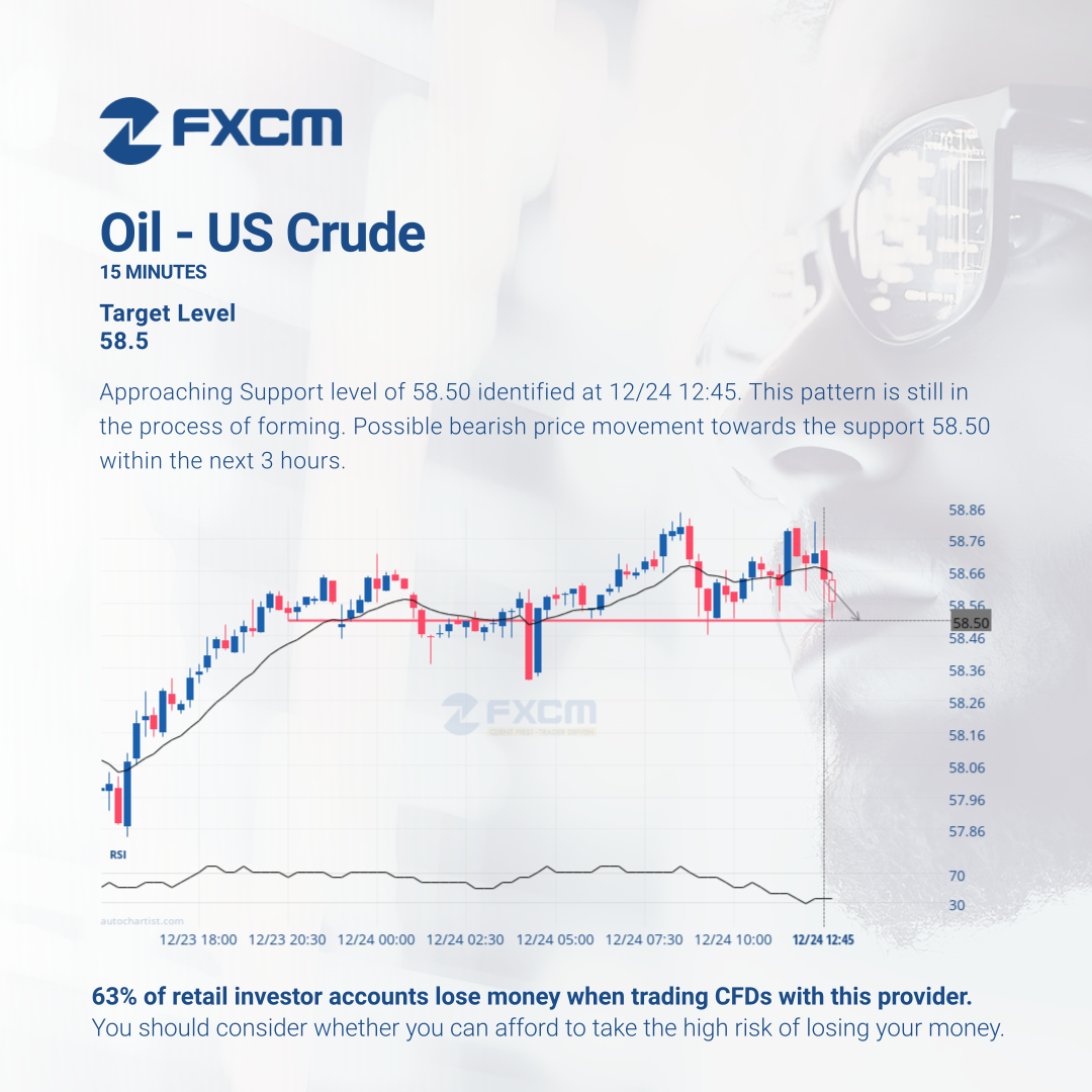 Approaching Support level of 58.50 identified at 12/24 12:45. This pattern is still in the process of forming. Possible bearish price movement towards the support 58.50 within the next 3 hours.