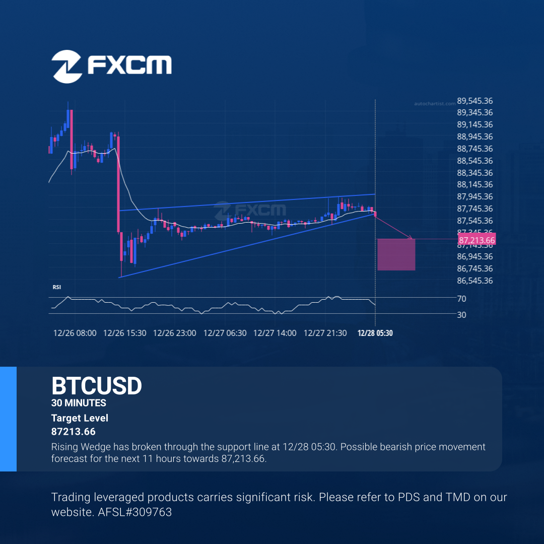 Rising Wedge has broken through the support line at 12/28 05:30. Possible bearish price movement forecast for the next 11 hours towards 87,213.66.