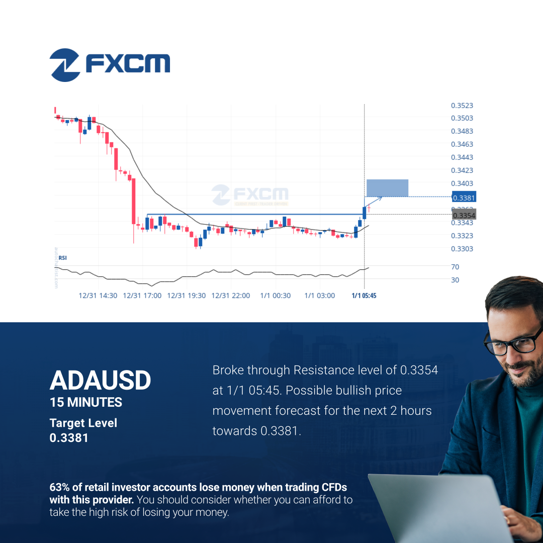 Broke through Resistance level of 0.3354 at 1/1 05:45. Possible bullish price movement forecast for the next 2 hours towards 0.3381.