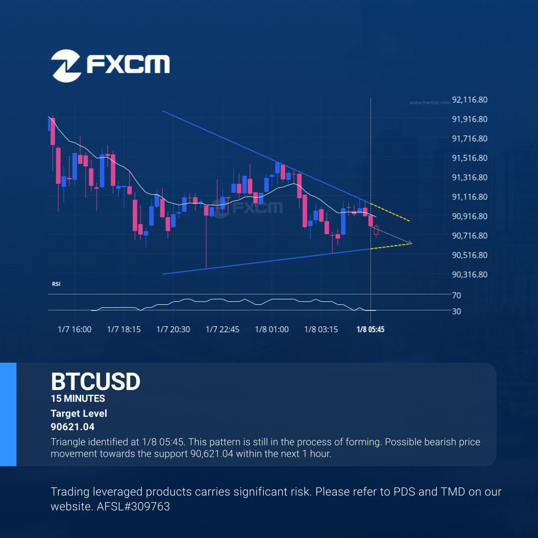 Triangle identified at 1/8 05:45. This pattern is still in the process of forming. Possible bearish price movement towards the support 90,621.04 within the next 1 hour.