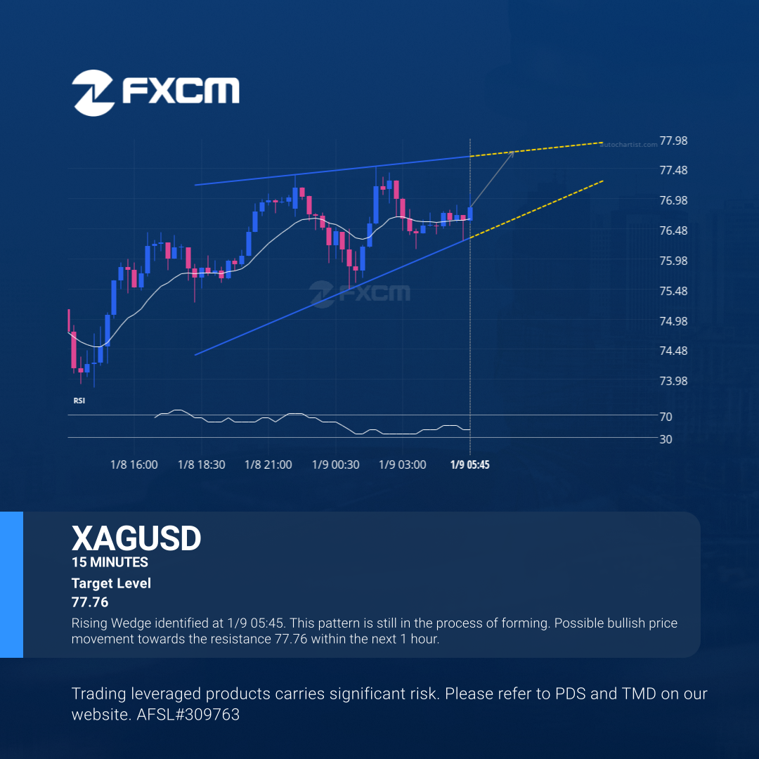 Rising Wedge identified at 1/9 05:45. This pattern is still in the process of forming. Possible bullish price movement towards the resistance 77.76 within the next 1 hour.
