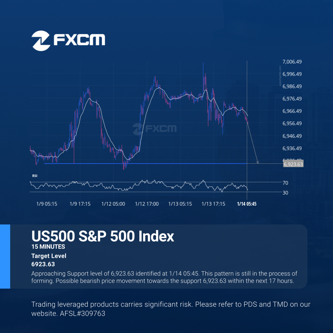 Approaching Support level of 6,923.63 identified at 1/14 05:45. This pattern is still in the process of forming. Possible bearish price movement towards the support 6,923.63 within the next 17 hours.