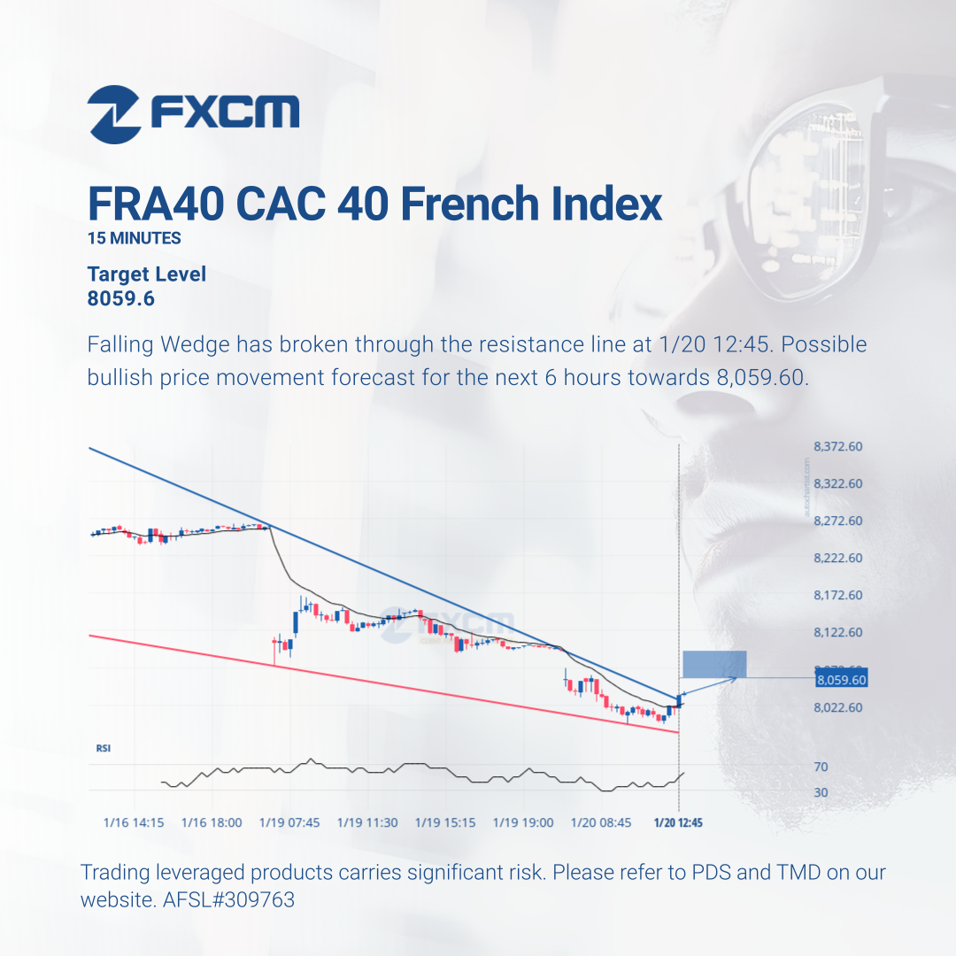 Falling Wedge has broken through the resistance line at 1/20 12:45. Possible bullish price movement forecast for the next 6 hours towards 8,059.60.