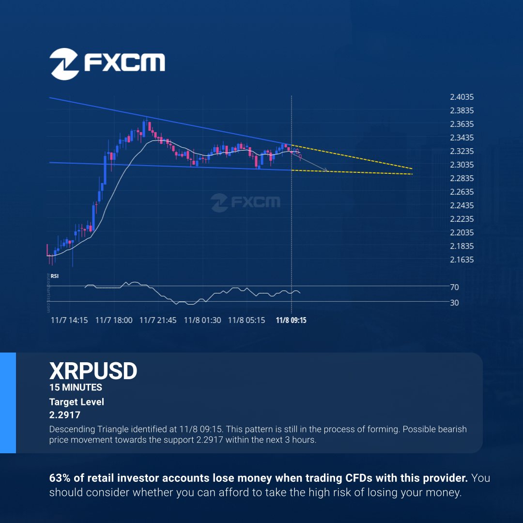 Descending Triangle identified at 11/8 09:15. This pattern is still in the process of forming. Possible bearish price movement towards the support 2.2917 within the next 3 hours.