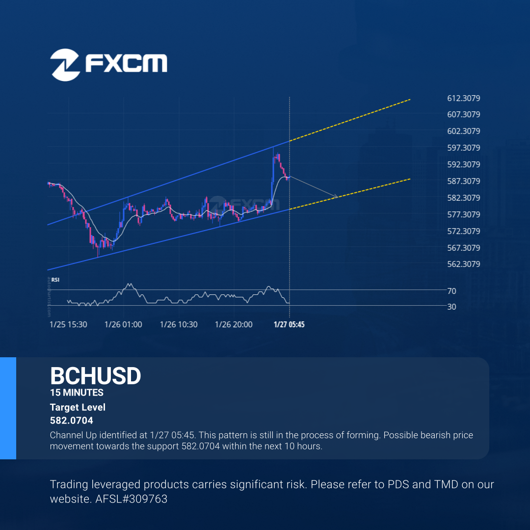 Channel Up identified at 1/27 05:45. This pattern is still in the process of forming. Possible bearish price movement towards the support 582.0704 within the next 10 hours.