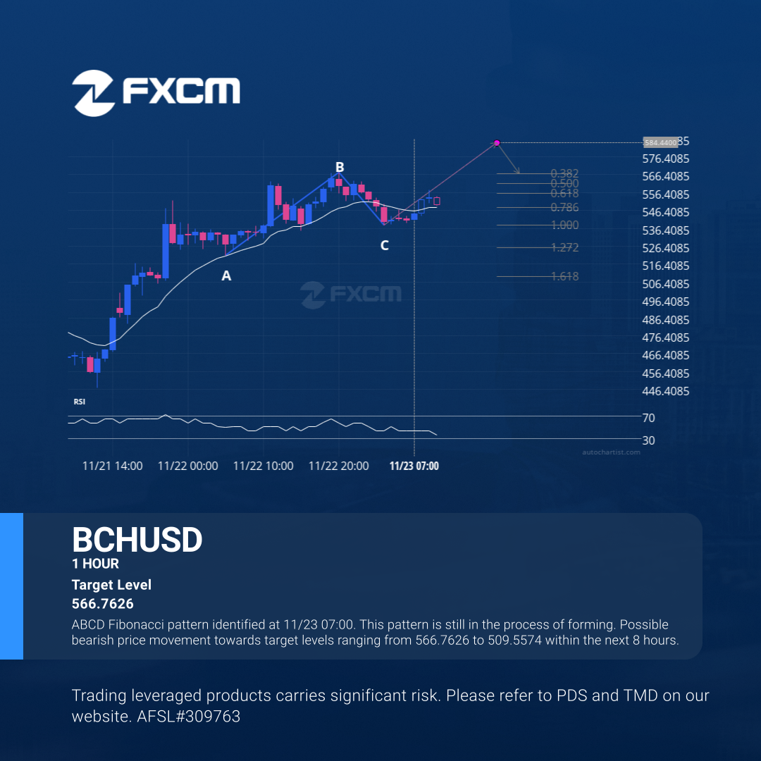 ABCD Fibonacci pattern identified at 11/23 07:00. This pattern is still in the process of forming. Possible bearish price movement towards target levels ranging from 566.7626 to 509.5574 within the next 8 hours.