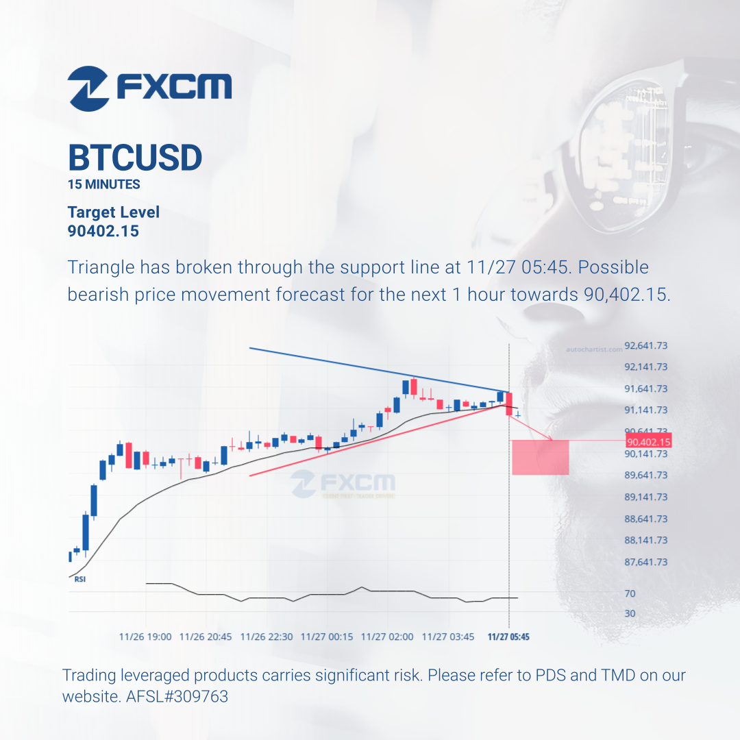 Triangle has broken through the support line at 11/27 05:45. Possible bearish price movement forecast for the next 1 hour towards 90,402.15.