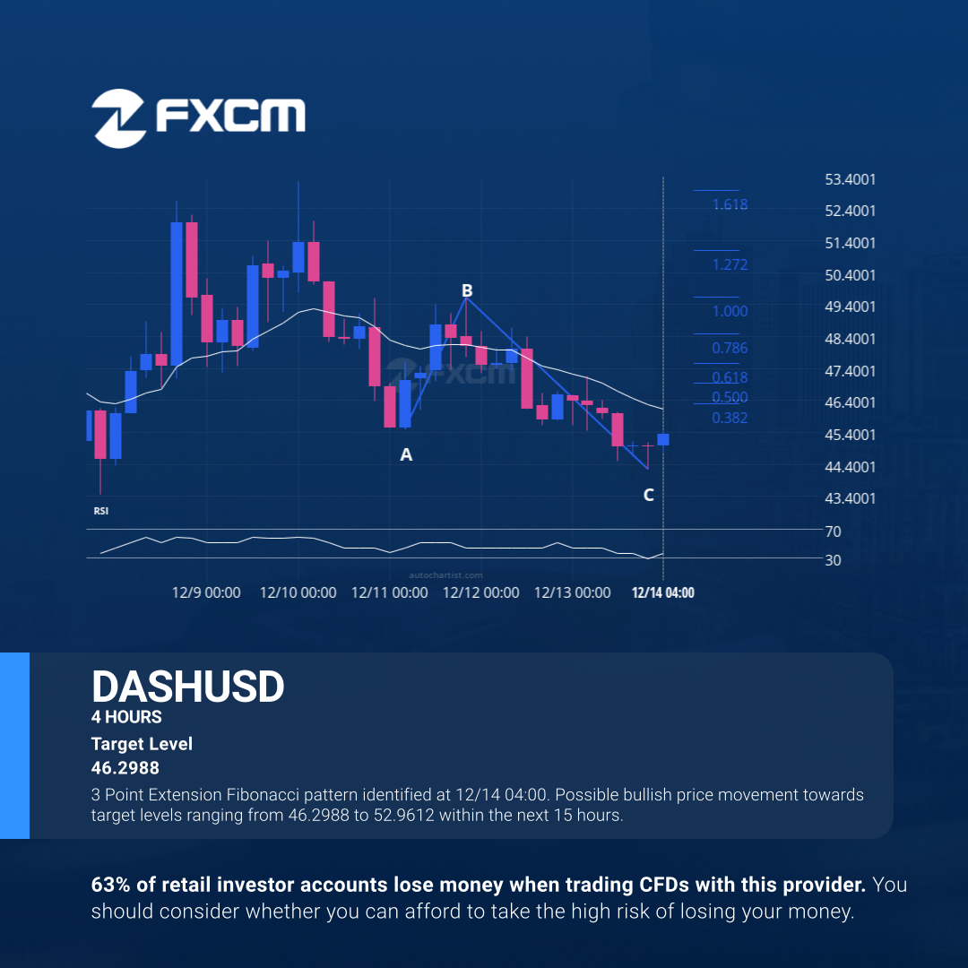 3 Point Extension Fibonacci pattern identified at 12/14 04:00. Possible bullish price movement towards target levels ranging from 46.2988 to 52.9612 within the next 15 hours.