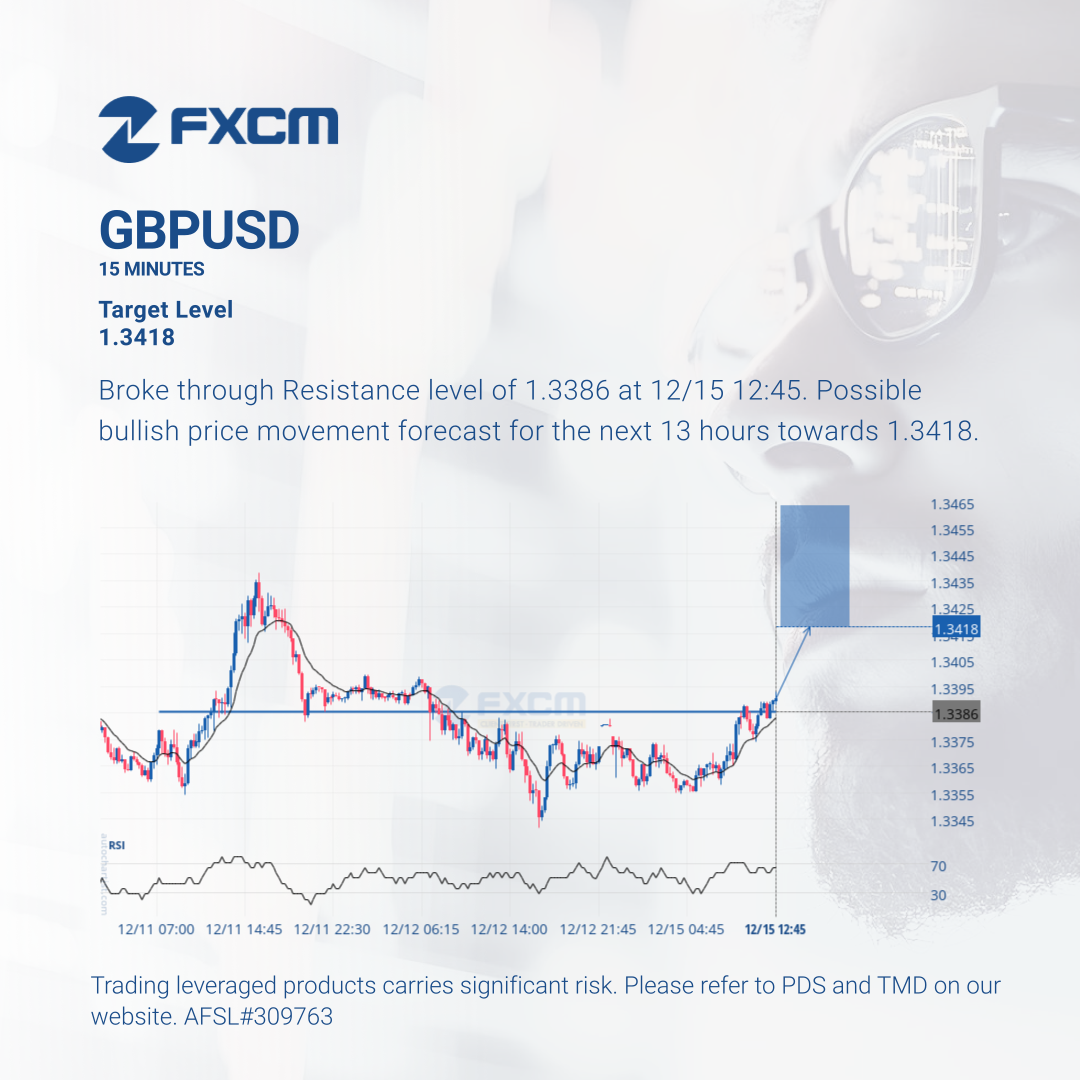 Broke through Resistance level of 1.3386 at 12/15 12:45. Possible bullish price movement forecast for the next 13 hours towards 1.3418.
