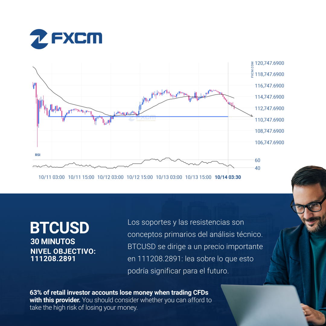 Se identificó un fuerte nivel de soporte en 111208.2891 en el gráfico de 30 Minutos de BTCUSD. Es probable que BTCUSD lo testee pronto.