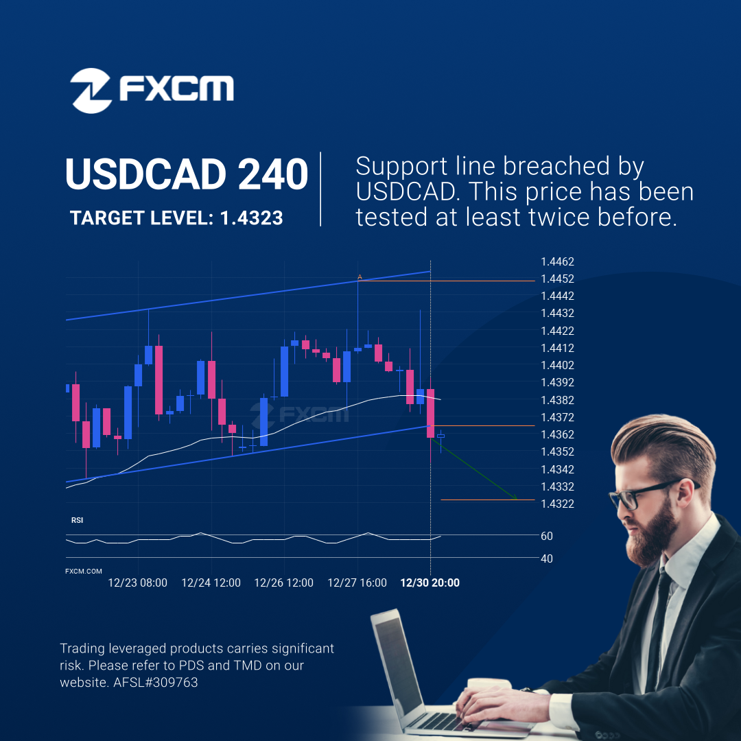 Channel Up pattern identified on USDCAD has broken through a support level with the price momentum continuing to move in an downward direction. A solid trading opportunity continues with the price expected to reach 1.4323 in the next 2.