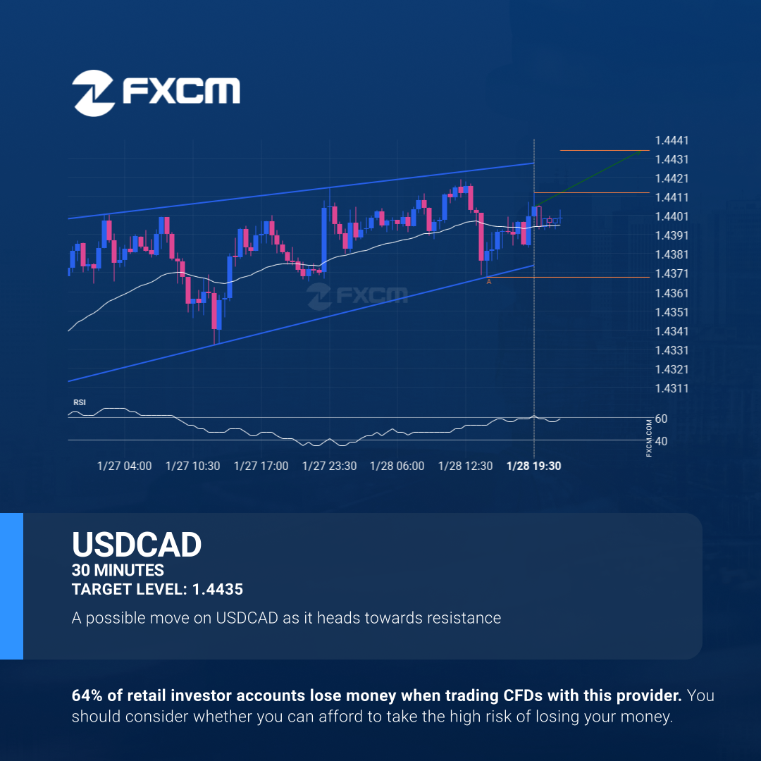USDCAD was identified at around 1.44133 having recently rebounded of the support on the 30 Minutes data interval. Ultimately, the price action of the stock has formed a Rising Wedge pattern. This squeeze may increases the chances of a strong breakout. The projected movement will potentially take the price to around the 1.4435 level.