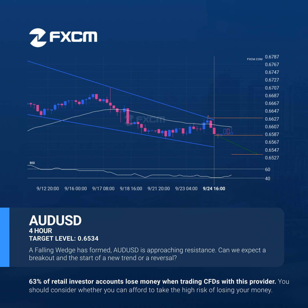 A Falling Wedge pattern was identified on AUDUSD at 0.658335, creating an expectation that it may move to the support line at 0.6534. It may break through that line and continue the bearish trend or it may reverse from that line.