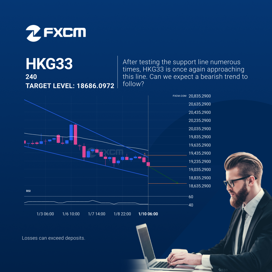 HKG33 is moving towards a support line which it has tested numerous times in the past. We have seen it retrace from this line before, so at this stage it isn’t clear whether it will breach this line or rebound as it did before. If HKG33 continues in its current trajectory, we could see it reach 18686.0972 within the next 2 days.