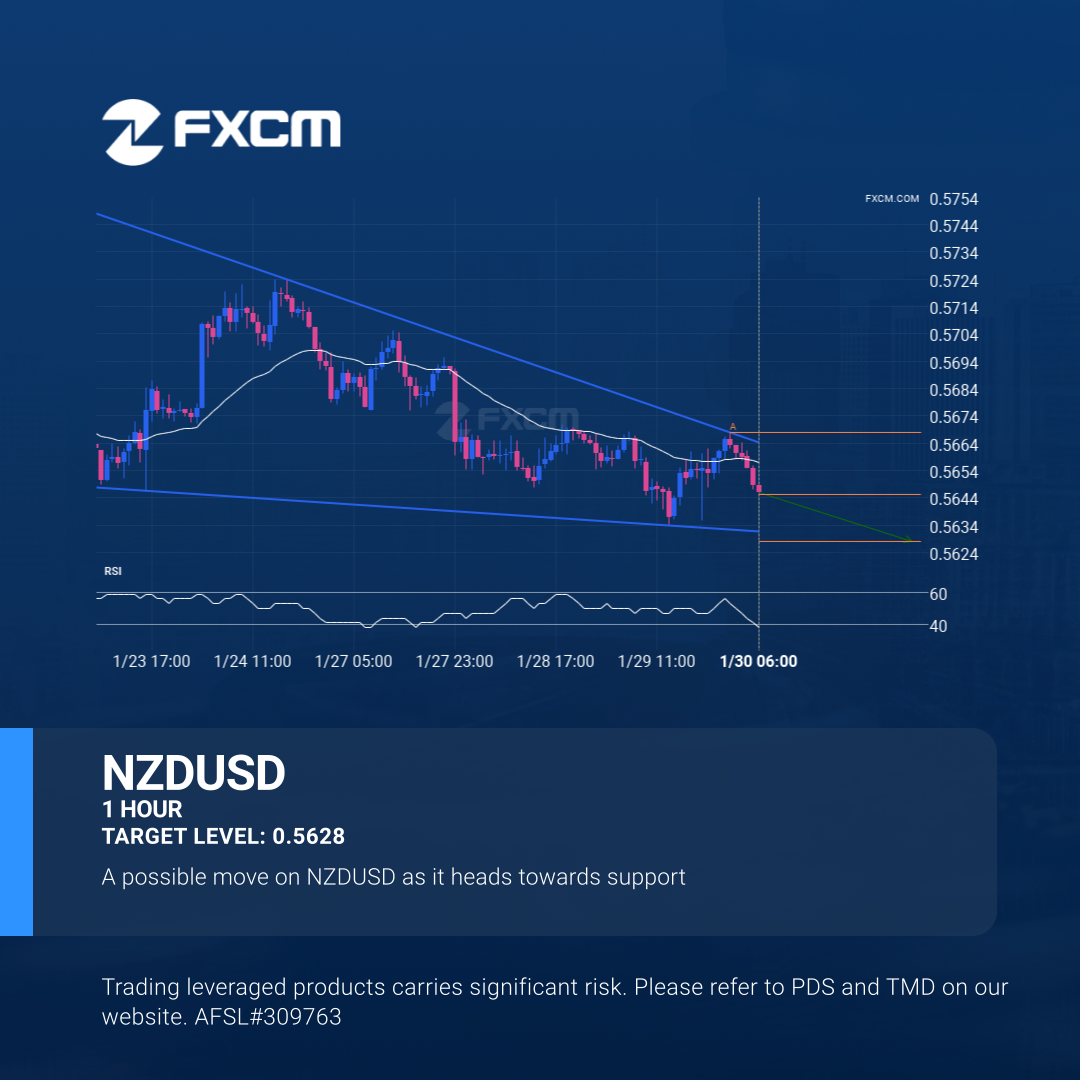 Emerging Falling Wedge detected on NZDUSD – the pattern is an emerging one and has not yet broken through resistance, but the price is expected to move up over the next few hours. The price at the time the pattern was found was 0.56453 and it is expected to move to 0.5628.